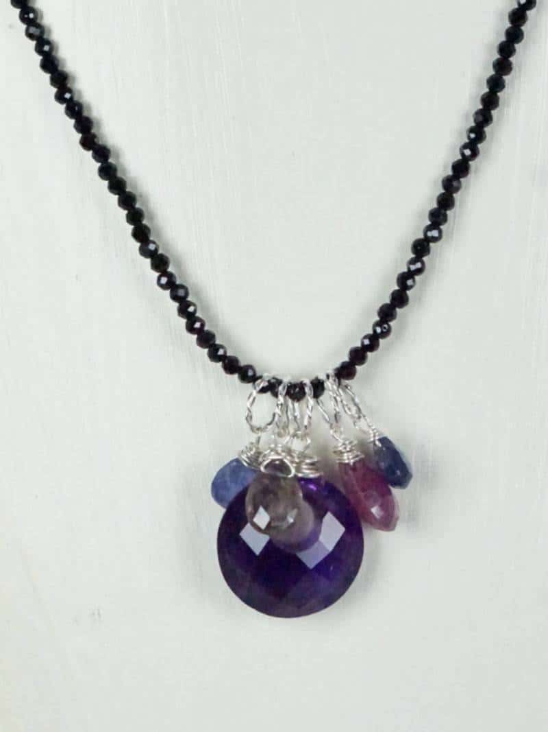 A 3/4 inch faceted Amethyst stone charm is wrapped in Sterling Silver and hangs on 30 Inches of beautiful black spinel. Other charms include Ruby, Tanzanite and Sapphire. The black spinel stones are faceted and cover the entire 30 inch necklace. This is a stunning one of a kind piece, beautifully crafted by artisans in the USA.
