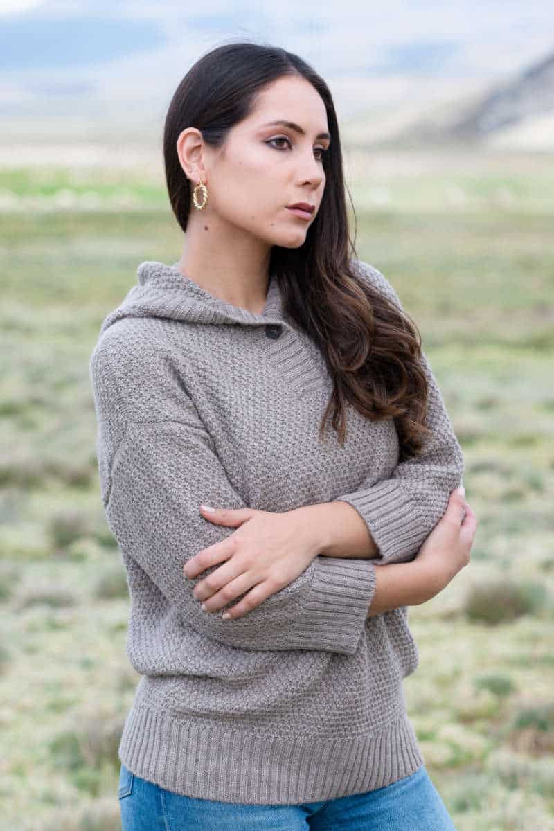 Our lux hooded pullover is knit in a waffle stitch for superior softness next to your skin.  It is made from 100% pure baby alpaca fiber and is all natural and undyed.  The yarn is a beautiful rose grey, the natural color of the alpacas from which the fiber was collected. Perfect for cocooning or for active fall and winter days.  Ribbed detailing on the cuffs, neckline and hood.  Buttery soft, light and warm, you’ll want to live in this hoodie!