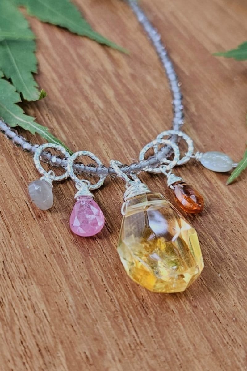 This bright and sparkly necklace features floating gems of a 17mm Citrine “nugget”, Rose Sapphire, Hessonite, Chocolate Moonstone and Chrysoberyl with 17″ of strung Smoky Quartz. It is finished with a sterling silver lobster clasp and 2″ extender chain.