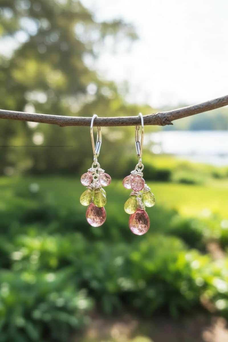 Suspended from sterling silver chains and secure sterling clasps, the Pink Topaz drops are joined by two complementary gemstones: Green Peridot and Pink Tourmaline. These accents add fresh pops of color and create a soft, cascading movement that brings the entire design to life. The full earring length measures 1½ inches from the top of the clasp to the bottom of the main stone—long enough to feel graceful, yet perfectly wearable for everyday elegance.