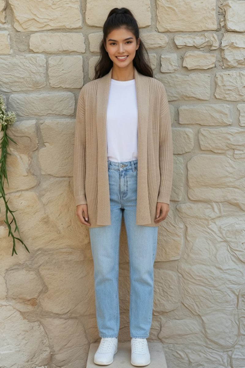 Designed with versatility in mind, this cardigan can be worn belted as a wrap for a chic, polished silhouette or left open for a relaxed, effortless look. The creamy beige shade was chosen for its universal appeal—it flatters every skin tone and pairs seamlessly with both casual and professional wardrobes. Whether layered over a simple tee, a crisp blouse, or a dress, it elevates your outfit with understated luxury.