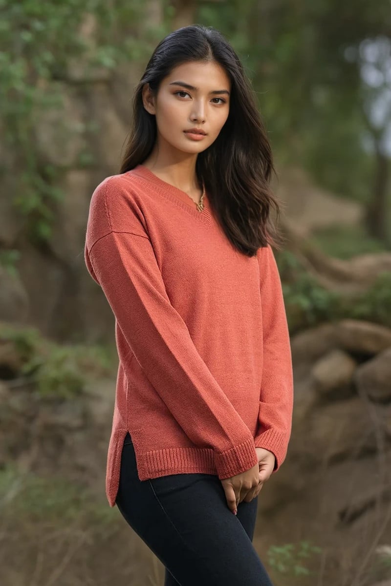 Available in three serene, naturally inspired shades—Creamy Beige, Lilac, Black, Barely Blue and our newest shades of Orchid Ice and Tandoori Spice—this V‑neck brings softness, elegance, and all‑day comfort to your wardrobe.